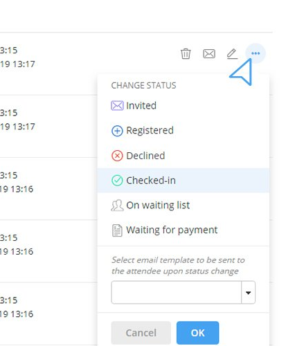 in v spustnem seznamu izberite nov status in izbiro potrdite s klikom na gumb Ok. Če želite ob spremembi statusa udeležencu poslati sporočilo, lahko v spustnem seznamu izberete enega od obstoječih templatov, ki naj se pošlje.