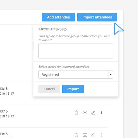 Če ste predhodno kreirali skupino kontaktov (glej Groups), ki bi jih želeli dodati med udeležence, kliknite gumb Import group (Uvozi skupino), v zgornjem polju skupino poiščite (vnesite nekaj znakov imena skupine) in jo izberite, v spodnjem spustnem seznamu izberite status, s katerim naj se udeleženci uvozijo, nato pa kliknite na gumb Import (Uvozi).