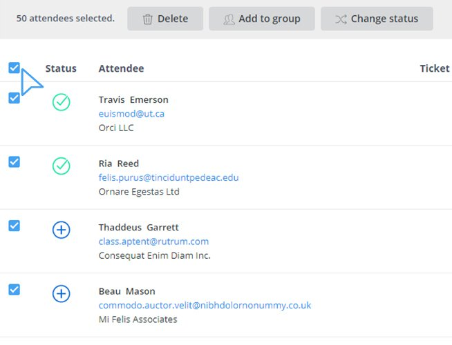 Akcija Change status (Spremeni status) deluje enako kot pri posameznem udeležencu (glej zgoraj), le da se status spremeni vsem izbranim udeležencem.