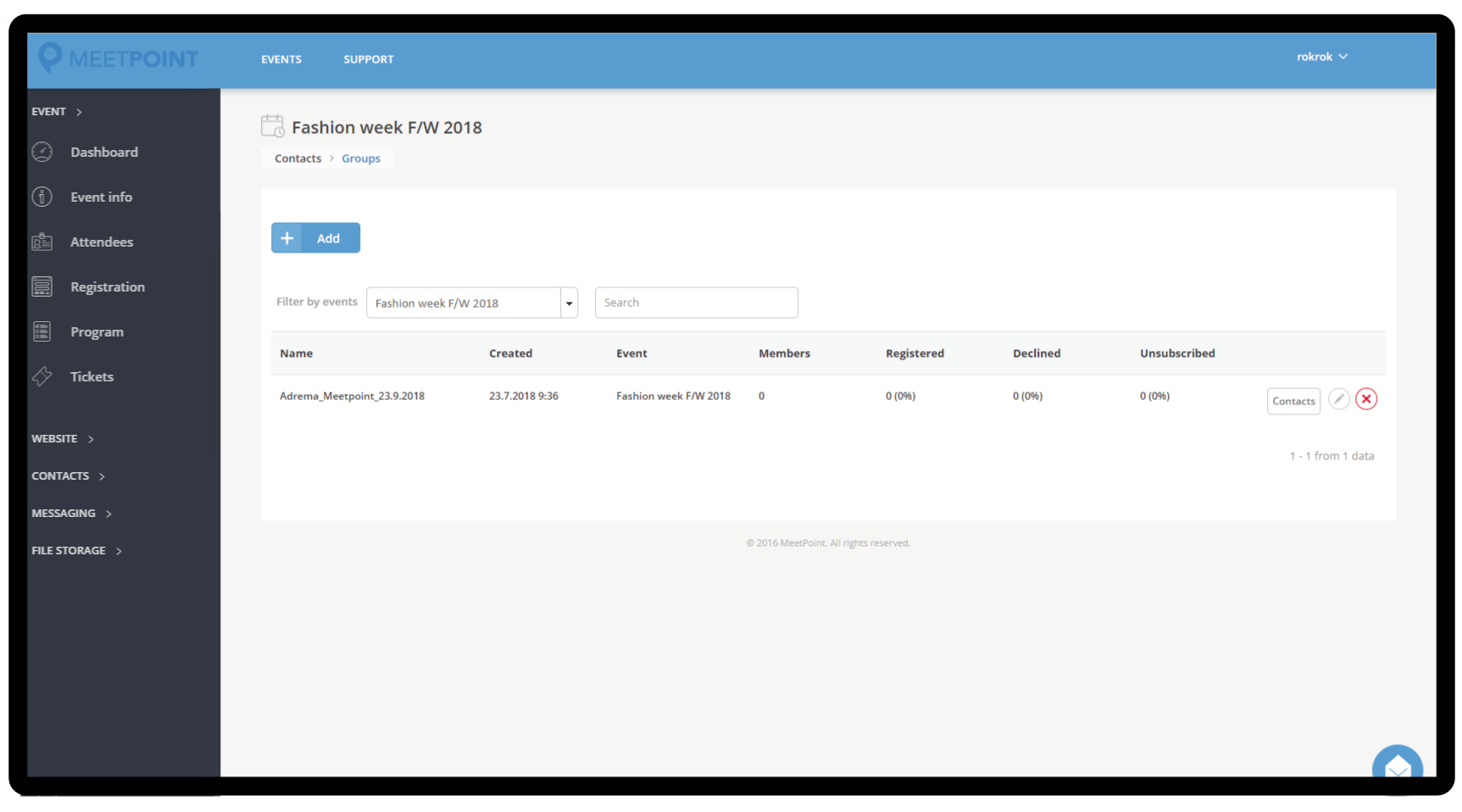 Grupa se avtomatsko shrani - v osnovnem polju imamo pregled nad njo - vidimo ime (NAME), kdaj smo jo kreirali (CREATED), v kateri dogodek se je grupa shranila (EVENT), koliko kontaktov naša skupina vsebuje -št. ljudi v grupi (MEMBERS*), koliko ljudi se je registraralo (REGISTRED*), koliko ljudi, je reklo, da jih ne bo na naš dogodek (DECLINED*) in koliko ljudi se je odjavilo od prejemanja obvestil preko e-maila (UNSUNSCRIBED*). *Zadnje 4 točKe, se vpišejo šele, ko imamo shranjene dogodke in ko so sporočila že poslana. Grupo lahko urejamo ali jo pobrišemo.