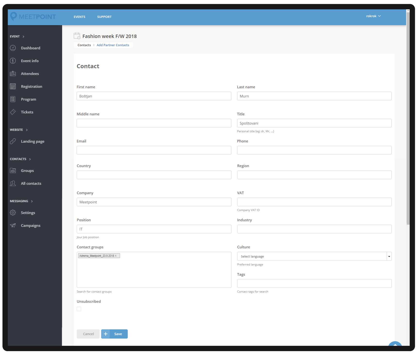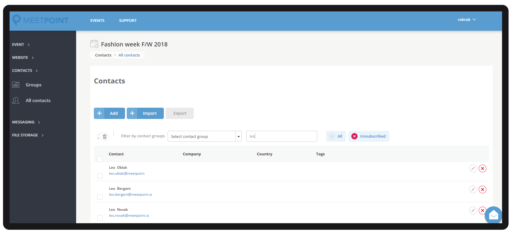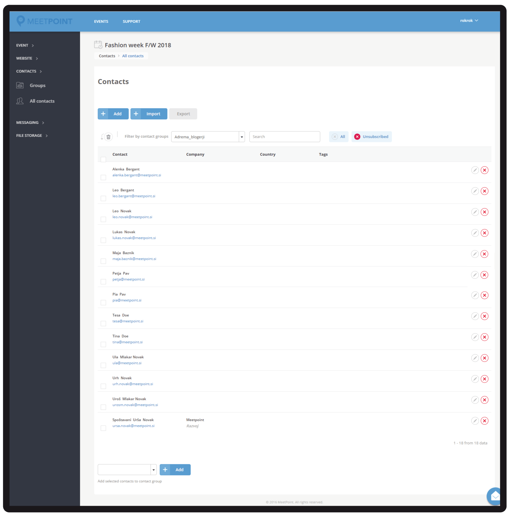 V PARTNER CONTACTS, so vse osebe, ki se nanašajo na določen account (ko vstopiš v aplikacijo – npr. če imamo več dogodkov, so tu zbrani vsi kontakti, ki smo jih kadarkoli dodali v ta account). V partner contacts lahko osebe iščemo in jih tudi urejamo. Urejamo jih s svinčnikom, izbrišemo jih s križcem. Kontakte lahko iščemo po filtrih – grupah, po mailih, imenih itd. Kontakte lahko izvozimo (gumb EXPORT) – npr. če izberemo vse, brez filtra in kliknemo excel, se nam avtomatično naredi excel, ki vsebuje podatke za določene osebe.