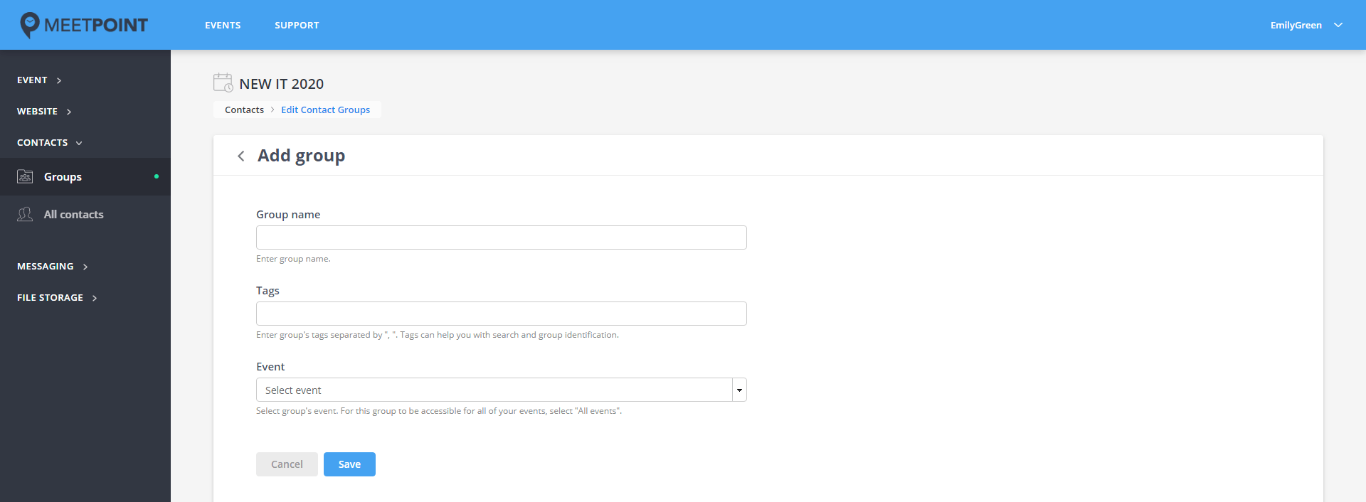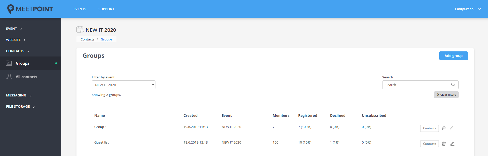 Skupina je lahko vezana na posamezen dogodek ali dostopna znotraj vseh dogodkov.