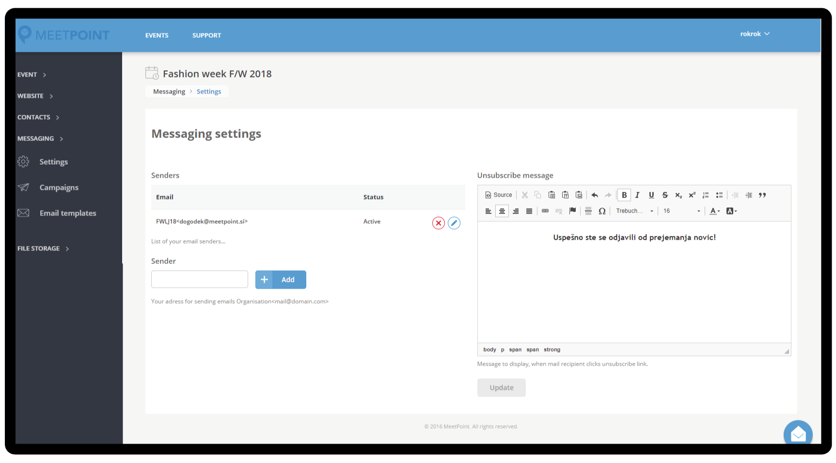 Nastavimo pošiljatelja - domena od koder dobimo sporočilo na naš e-mail. Lahko nastavimo več senderjev - več pošiljateljev, tako naša vabila personaliziramo.