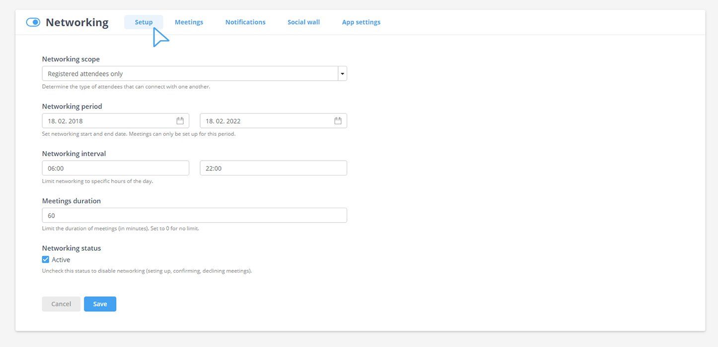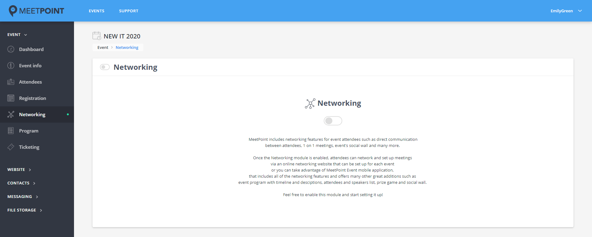 Modul Networking zajema naprednejše funkcionalnosti MeetPointa, kot so mreženje med udeleženci oz. organiziranje sestankov med udeleženci na dogodku preko MeetPoint spletnega mesta za mreženje ali MeetPoint mobilne aplikacije za dogodek. Na tem mestu lahko upravljate tudi s potisnimi sporočili mobilne aplikacije in sporočili Social wall-a vašega dogodka.